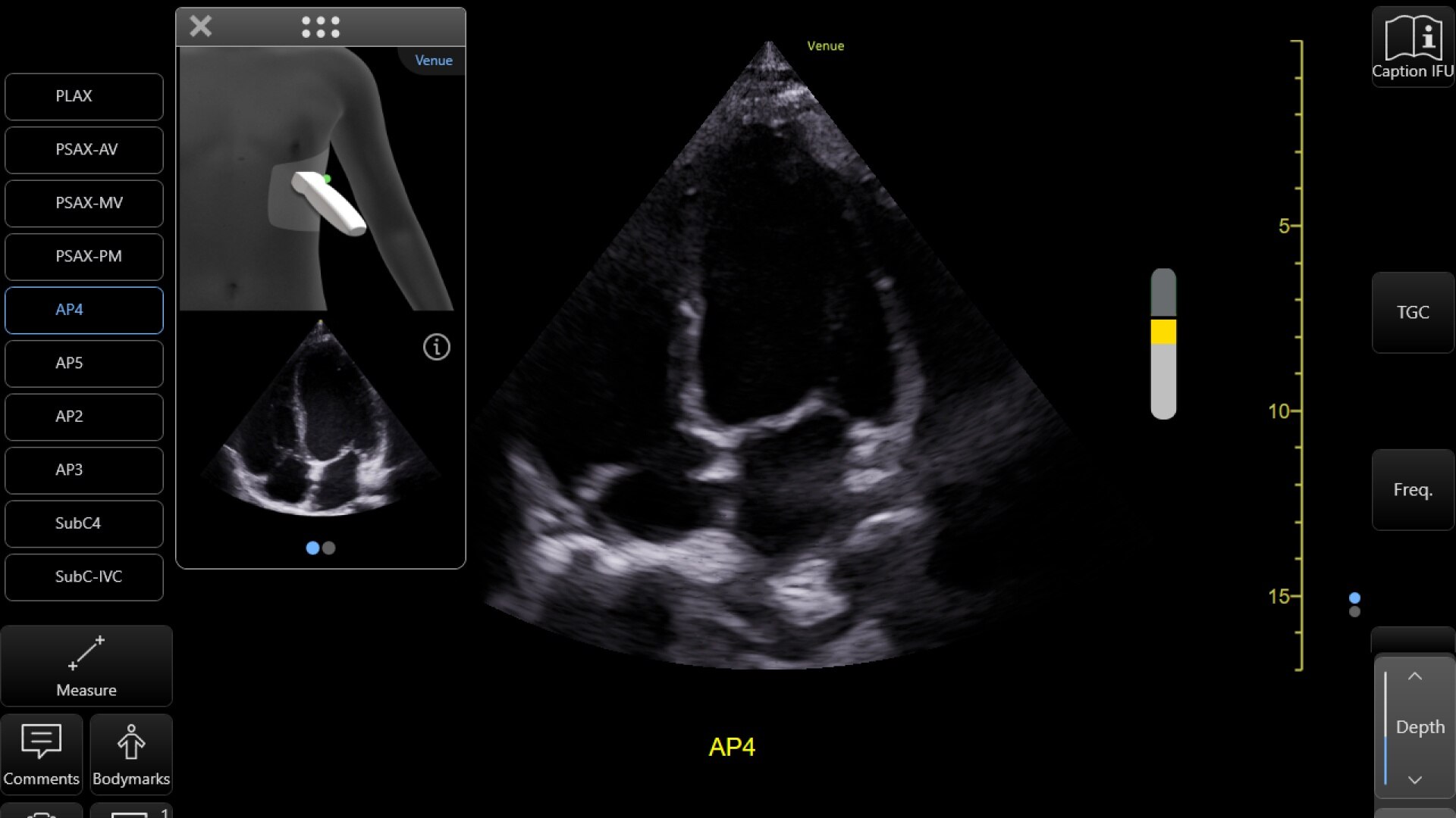 Le informazioni preliminari sul posizionamento della sonda mostrano dove posizionare e come orientare la sonda ecografica. Una volta iniziato l'esame, un'immagine di riferimento mostra l'immagine in fase di acquisizione.